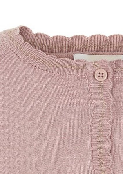 deauville mauve roze, in de boordjes langs hals, knoopslijn, zoom en pols is een subtiel gouddraadje meegebreid