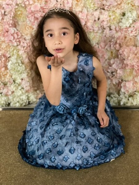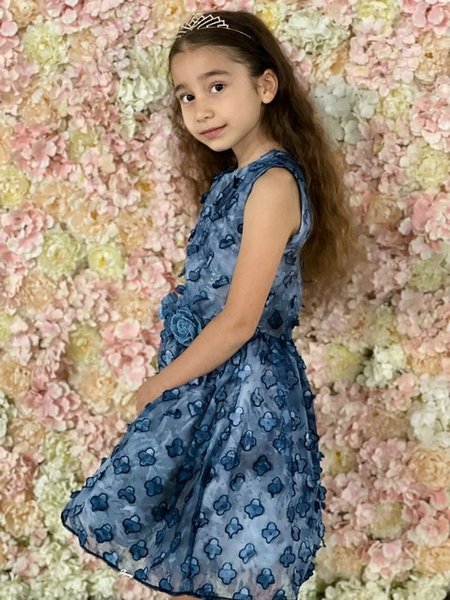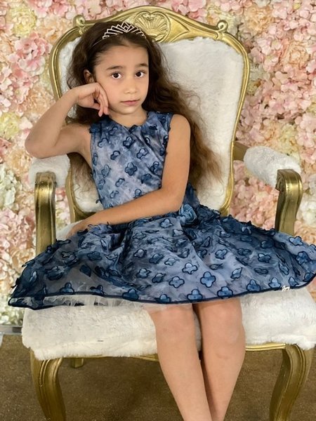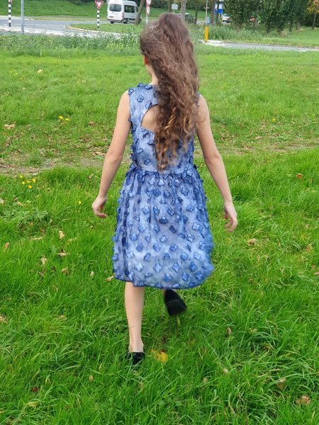 Prachtig uitgewerkt jurkje met 3D bloemen op. De rijke rok heeft een onderrok met een wolk aan lagen tule. Aparte ruguitsnijding