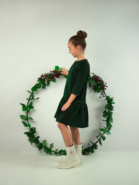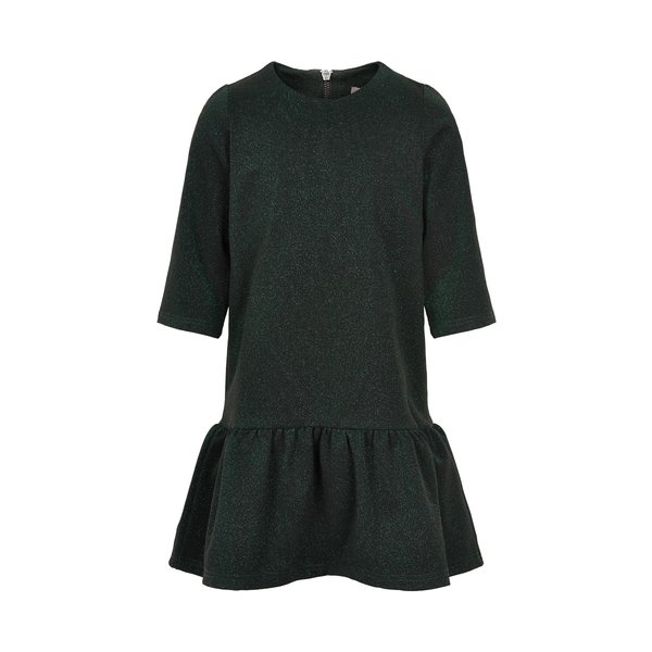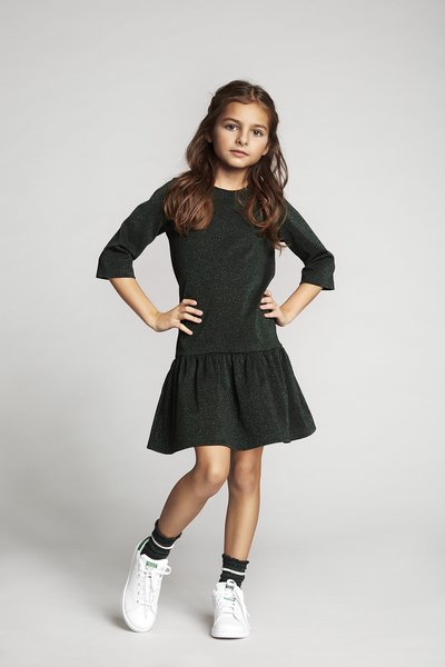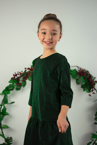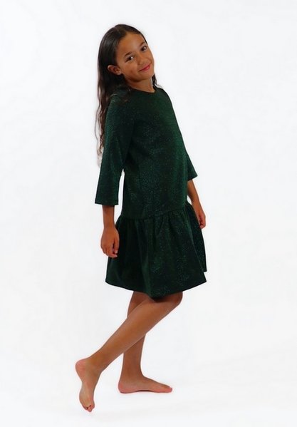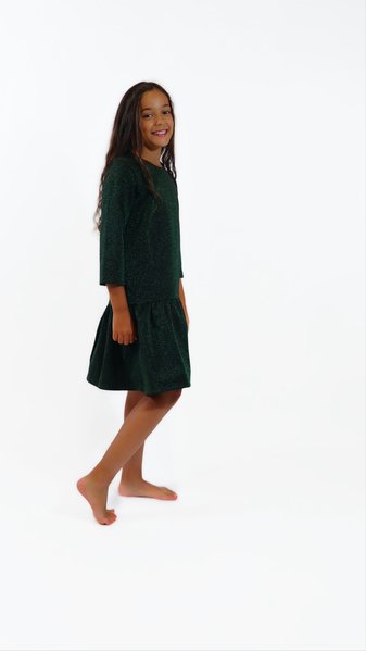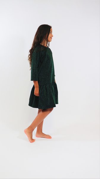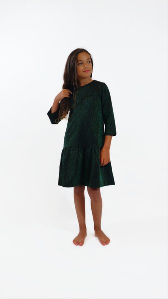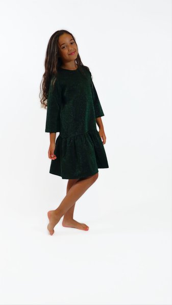 lief feestjurkje in donkergroen met een glittertje, het jurkje heeft 3/4 mouwen