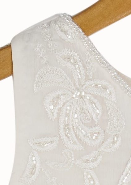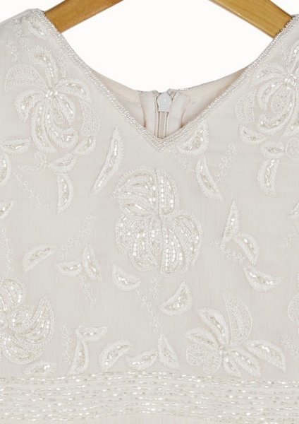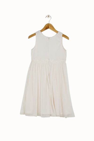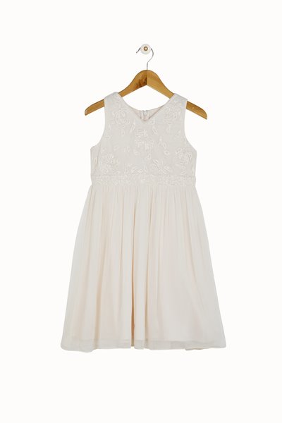 Het feestjurkje “Mathilde” is zacht lichtroze van kleur. Het heeft een mouwloos ontwerp met een geborduurd lijfje. De rok is gemaakt van een zachte, vloeiende stof, wat het een luchtige uitstraling geeft. De borduursels op het lijfje bestaan uit bloemenpatronen.