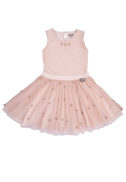 feestjurkje in zacht licht roze met opgestikte kraaltjes op de tule rok, het bovenlijfje is van jersey wat maakt dat het jurkje heerlijk zit.