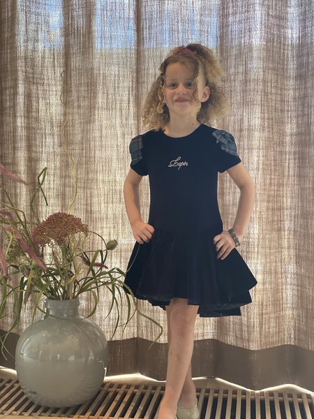 Mooie navy blauwe fluwelen jurk voor meisjes van Lapin House, strikjes in Schotse ruit op de open schouders en een diamantlogo op het lijfje. Het feestelijke jurkje is geheel gevoerd met katoen en heeft een naar achter een langere zoom, op de voering een strook met Schotse ruit.