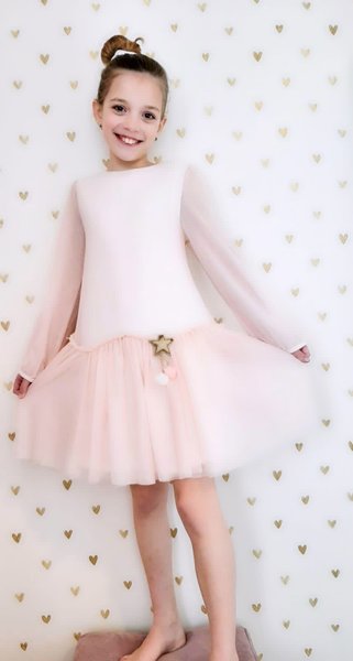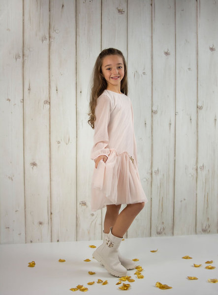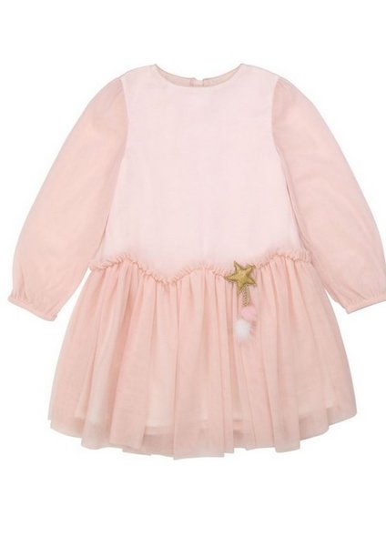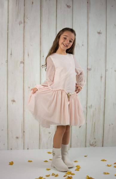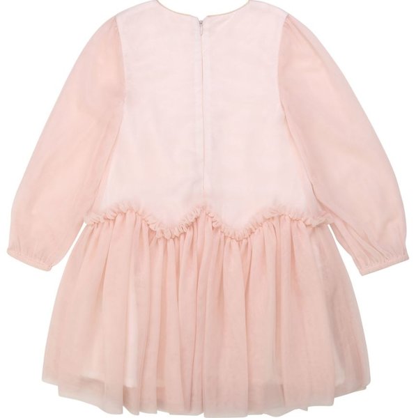Billieblush, roze feestjurkje van mesh met licht doorzichte mouwen en gevoerd lijfje, roze feestjurk voor meisjes