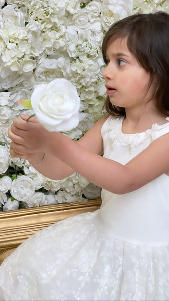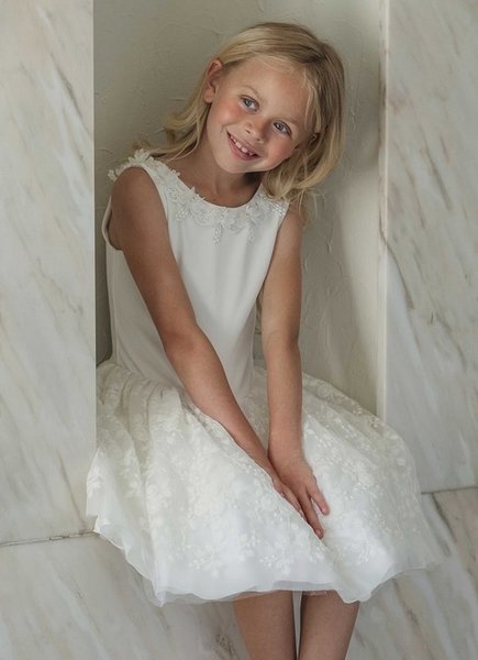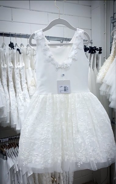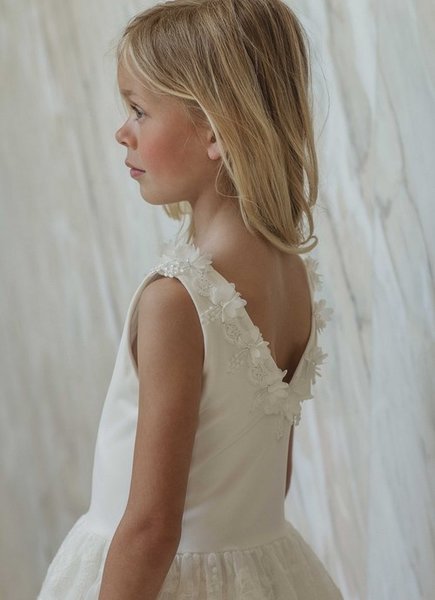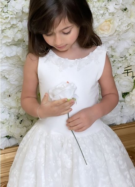 Prachtig uitgewerkt jurkje met 3d bloemen langs hals, achter mooie lage halslijn. De rijke rok bestaat uit een wolk aan lagen tule in verschillende lengtes.