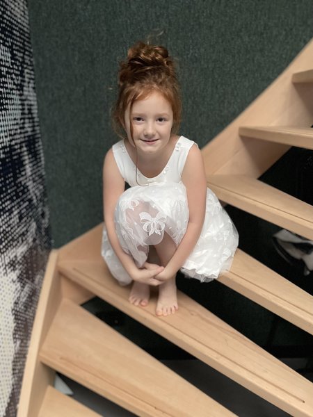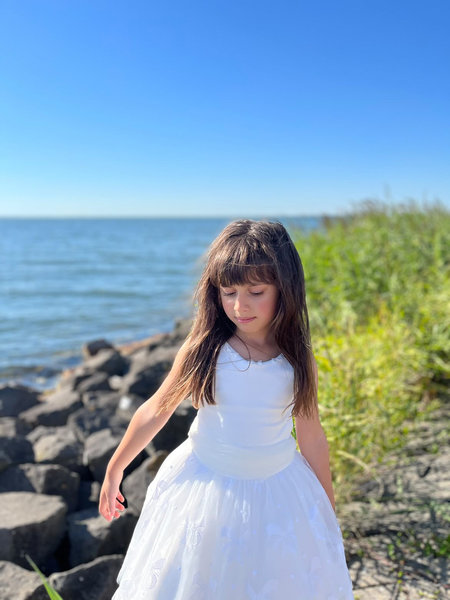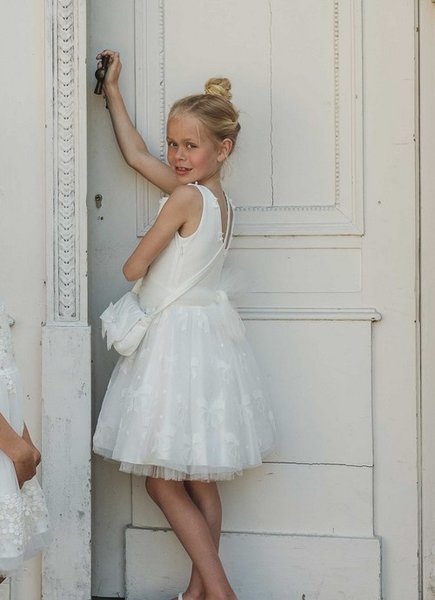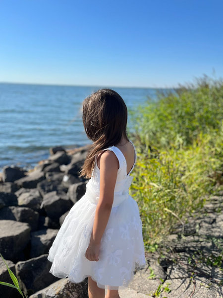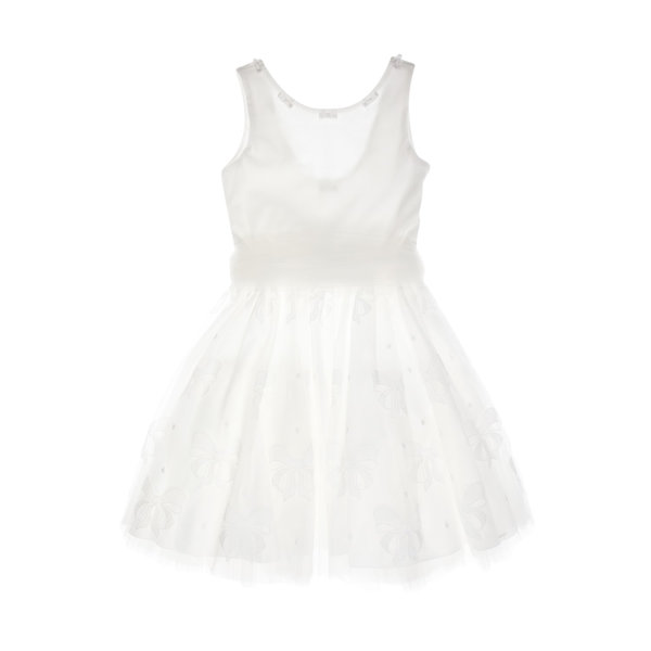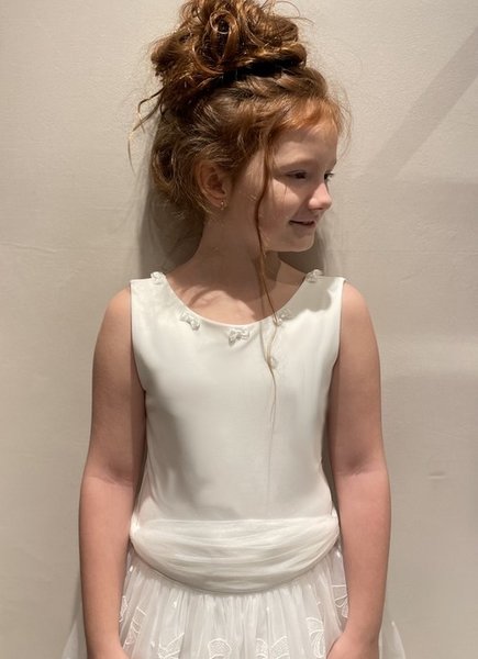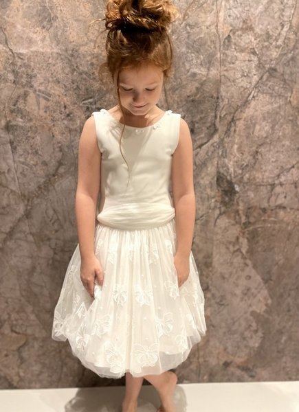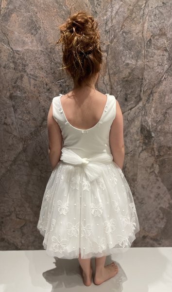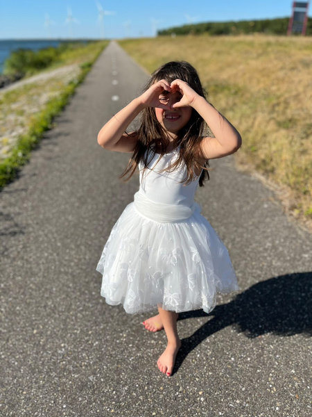 Prachtig uitgewerkt jurkje met strikken op de rok. De rijke rok bestaat uit een wolk aan lagen tule in verschillende lengtes.