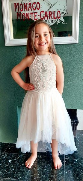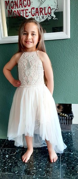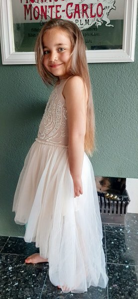 prachtig zandkleuring feestjurkje, het lijfje is rijk borduurt