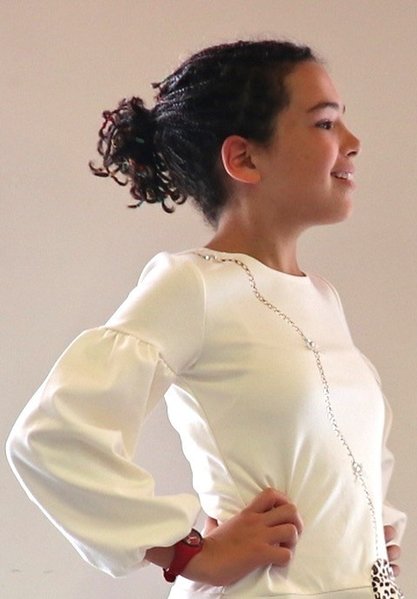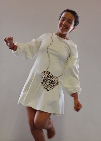 jurkje met lange mouwen die bij de polsen zijn geplooid. Het heeft een opgestikt tasje met panterpatroon. het tasje bevindt zich op heuphoogte, waardoor het als een functioneel zakje kan worden gebruikt.